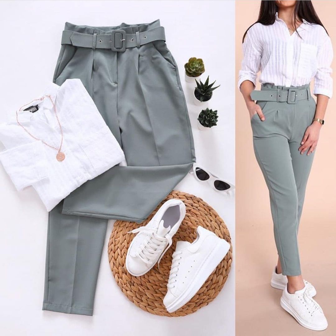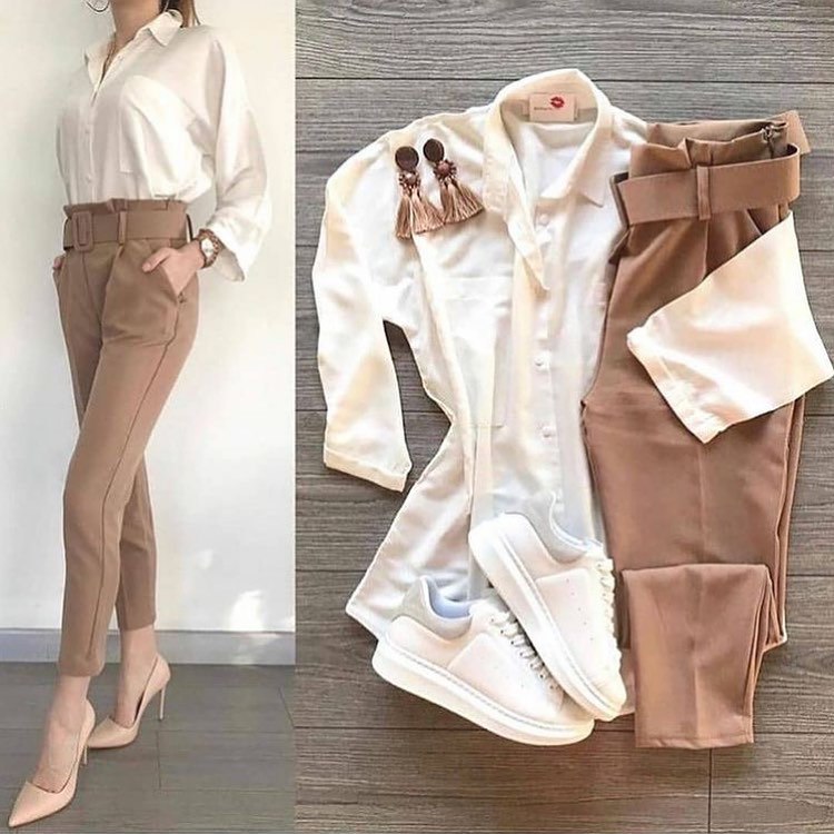 Еще один вариант – в стиле casual. Вы можете надеть классические брюки с белой рубашкой, а дополнить образ кроссовками. Такой лук подойдет как для деловой встречи, так и для более неформальной обстановки.