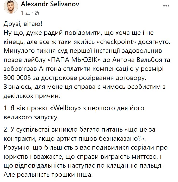 "Очень рад сообщить, что хотя еще и не конец, но все же какой-то "checkpoint" достигнут. На прошлой неделе суд первой инстанции удовлетворил иск лейбла Papa Music к Антону Вельбою и обязал Антона выплатить компенсацию в размере 300 тысяч долларов за досрочное расторжение договора", - говорится в публикации Селиванова. Также юрист подчеркнул, что это решение имеет важное значение и для украинского шоу-бизнеса в целом: