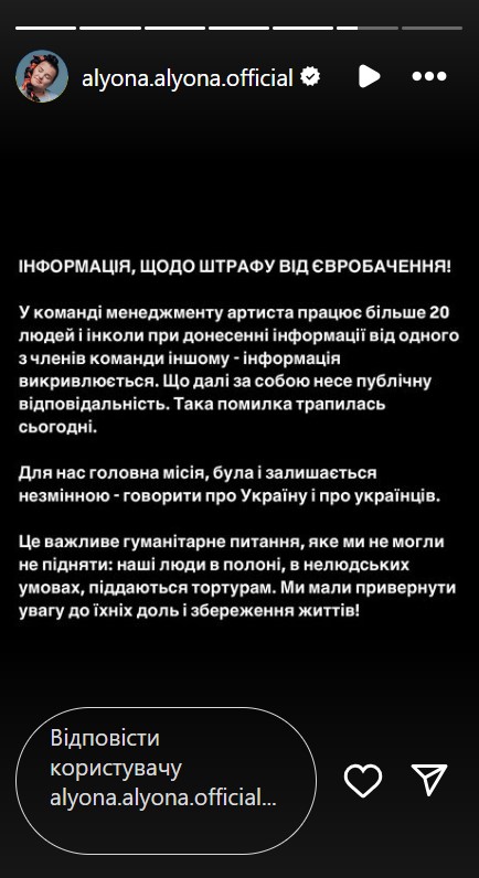 alyona alyona уже прокомментировала ранее произнесенные слова о штрафе и назвала их "ошибкой со стороны команды".
