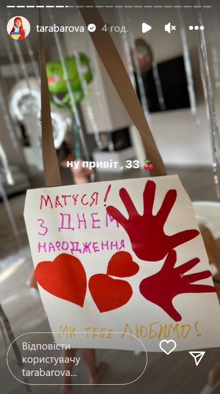 В Instagram-stories исполнительница показала, что получила от малышей сумочку из бумаги, на которой было трогательное послание. "Мамочка, с днем рождения! Мы тебя любим", - написали дети и оставили в подписи к словам вырезанные из картона ручки и сердечки. Тарабарова призналась, что была очень растрогана таким сюрпризом: "Это самый лучший подарок в мире. Спасибо!".