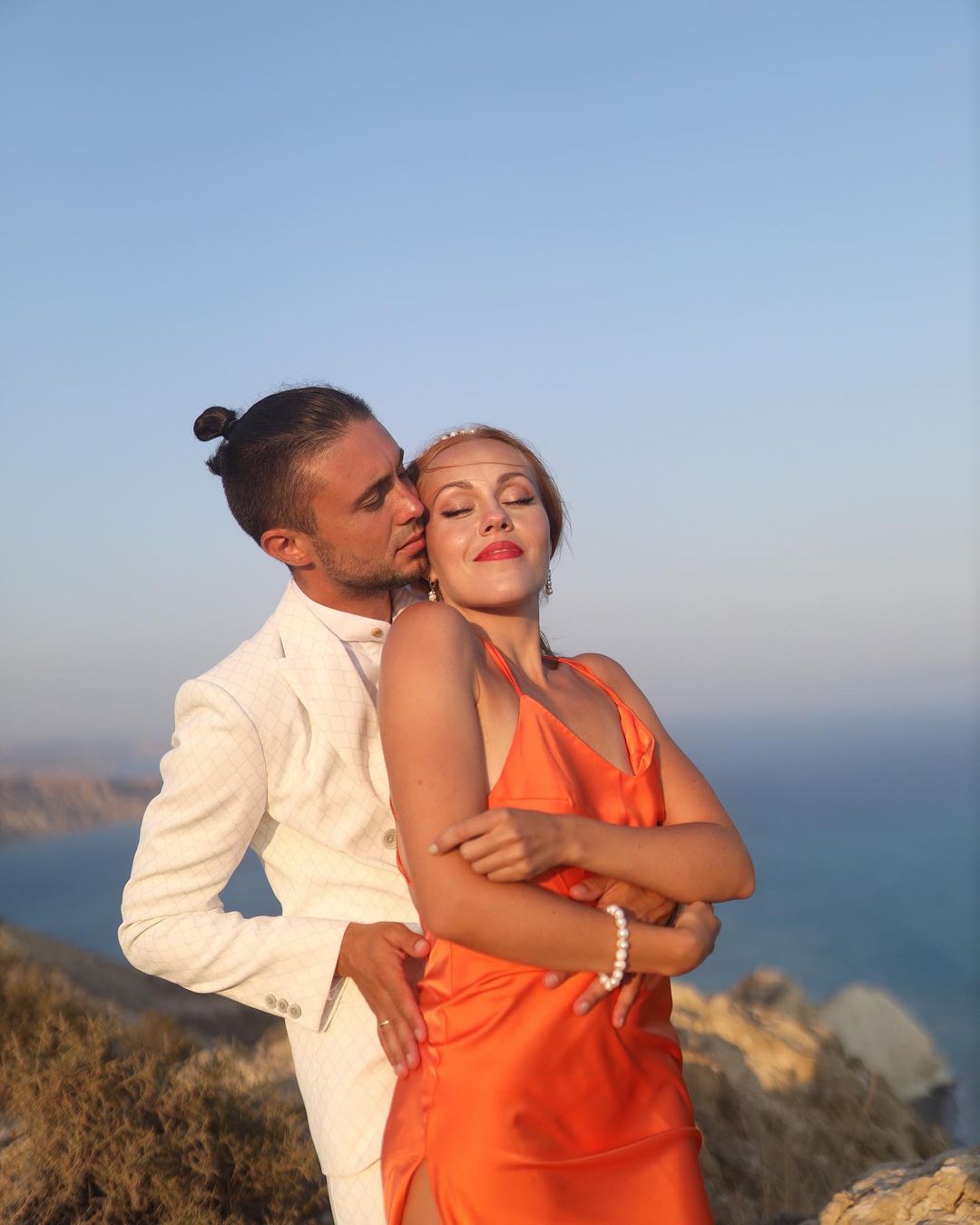 Для фотосессии певица выбрала еще один наряд этого же бренда - платье в бельевом стиле из струящегося апельсинового шелка с разрезом от бедра. Тарас Тополя позировал в костюме молочного оттенка, который сочетал с белой рубашкой.