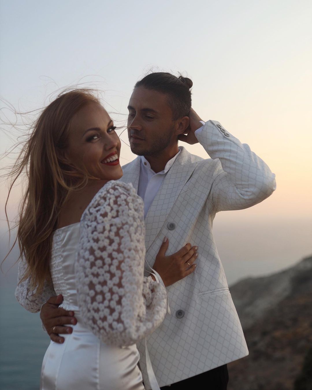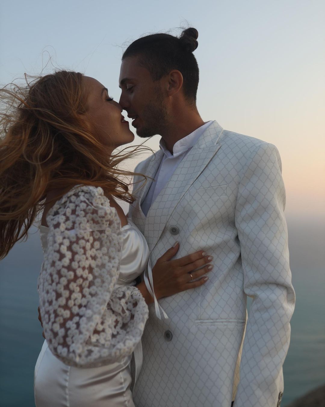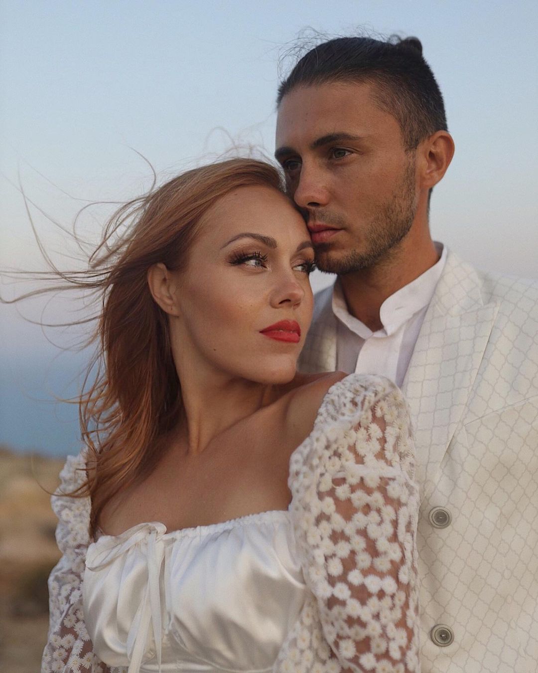 На снимках пара позирует в белых нарядах. Певица нарядилась в шелковое платье миди с объемными рукавами ручной вышивки и игривым разрезом на ноге бренда Girls Atelier. Стоимость изделия - 3499 грн.