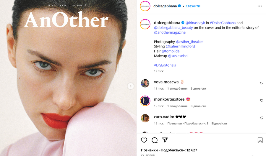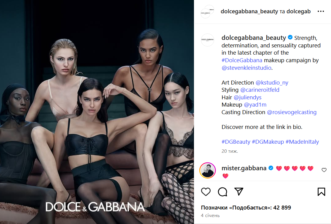 Известно, что музой дизайнеров Доменико Дольче и Стефано Габбана является российская супермодель Ирина Шейк, которая много лет живет в США. Так, например в 2025 году россиянка стала лицом новой рекламной кампании бренда, а также появилась на обложке Dolce & Gabbana Beauty.