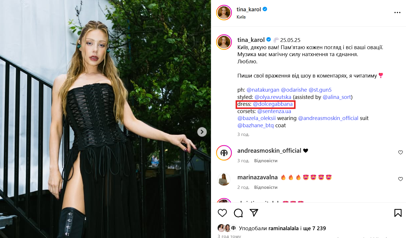 В посте исполнительница отметила людей, причастных к ее концерту, в частности известный мировой бренд Dolce & Gabbana, платье которого Тина выбрала для своего выступления.