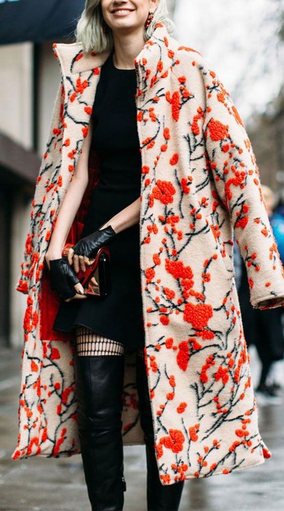 На весну также можно присмотреть пальто с ярким или цветочным принтом. Такой вариант пальто точно выделит вас из толпы.