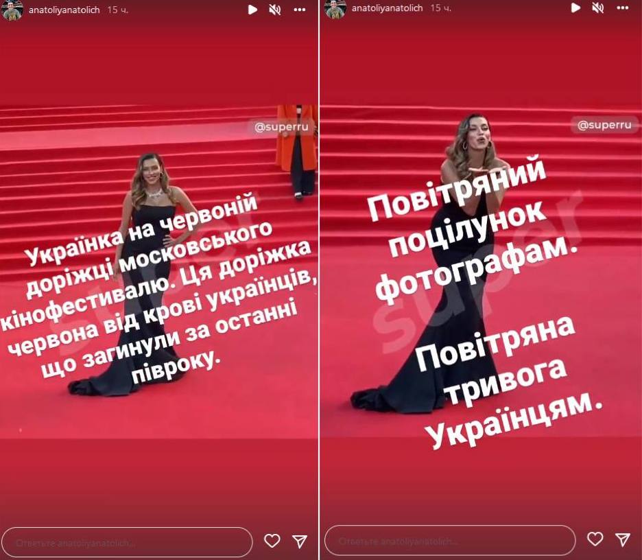 Анатолий Анатолич не смог спокойно смотреть, как Тодоренко красуется на дорожке, "красной от крови украинцев", и призвал больше не вспоминать предательницу и не называть ее украинкой. "Давайте закроем эту тему, и самое главное этого человека для себя навсегда. Цинизм высшего уровня, который демонстрирует эта женщина, уже меня даже не удивляет", - написал украинский телеведущий в своем Instagram.