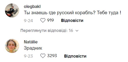 Одни из топовых комментариев, набравших больше всего лайков - "Ты знаешь, где русский корабль? Тебе туда!", "Предатель". Некоторые комментаторы советуют певцу идти воевать.