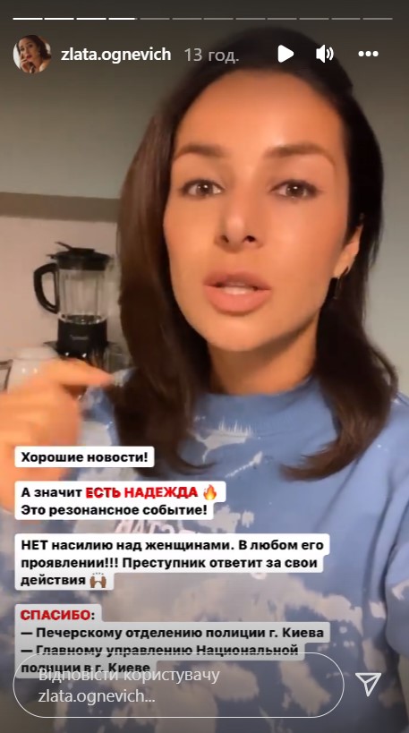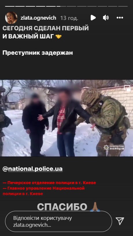 "У меня для вас очень хорошие новости! Сегодня преступника задержали. Спасибо огромное Печерскому отделению полиции и всей команде, которая искала этого человека. Когда мне позвонил следователь, я просто от эмоций расплакалась, потому что я не спала всю ночь. Я волновалась, потому что он мог быть где угодно… Он мог просто поджидать моих родителей под подъездом… Ой, я даже думать не хочу об этом. У меня появилась надежда, и мы это дело доведем до конца. Это действительно резонансное событие", - сказала Огневич.