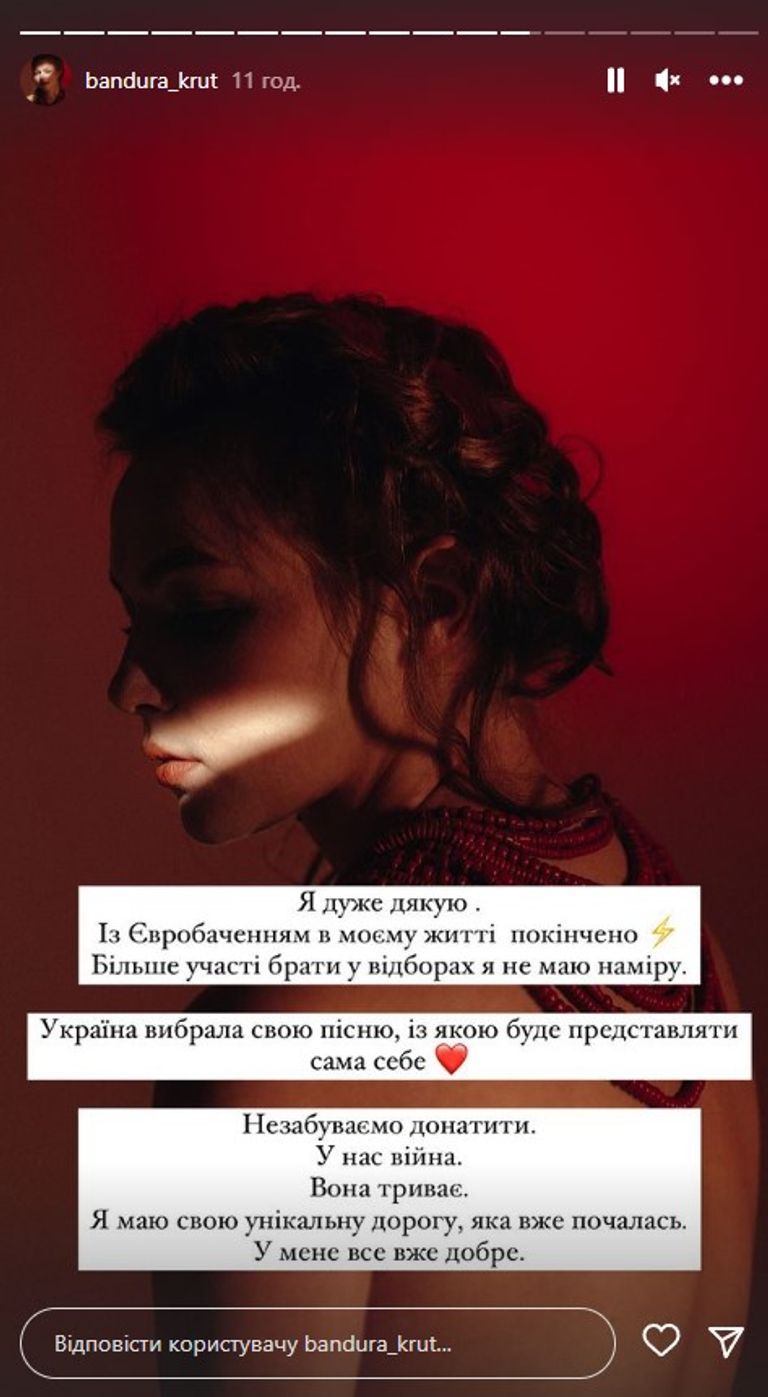"Украина выбрала свою песню, с которой будет представлять сама себя. У нас война. Она продолжается. У меня есть уникальная дорога, которая уже началась. У меня все уже хорошо", - написала певица-бандуристка в Instagram-историях.
