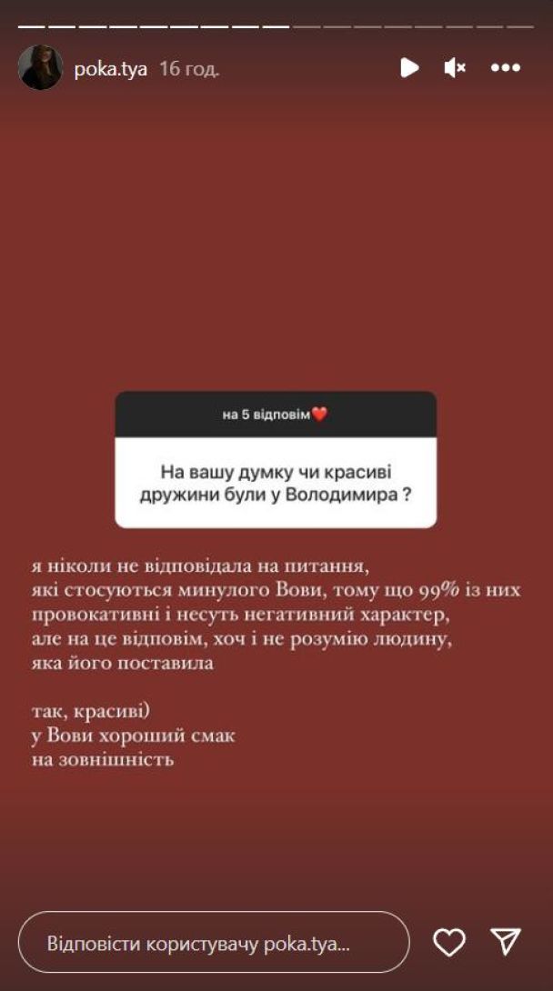 "Я никогда не отвечала на вопросы, касающиеся прошлого Вовы, потому что 99% из них – провокативные и несут негативный характер. Но на этот отвечу, хоть и не понимаю человека, который его поставил. Да, красивые. У Вовы хороший вкус на внешность", - написала она.