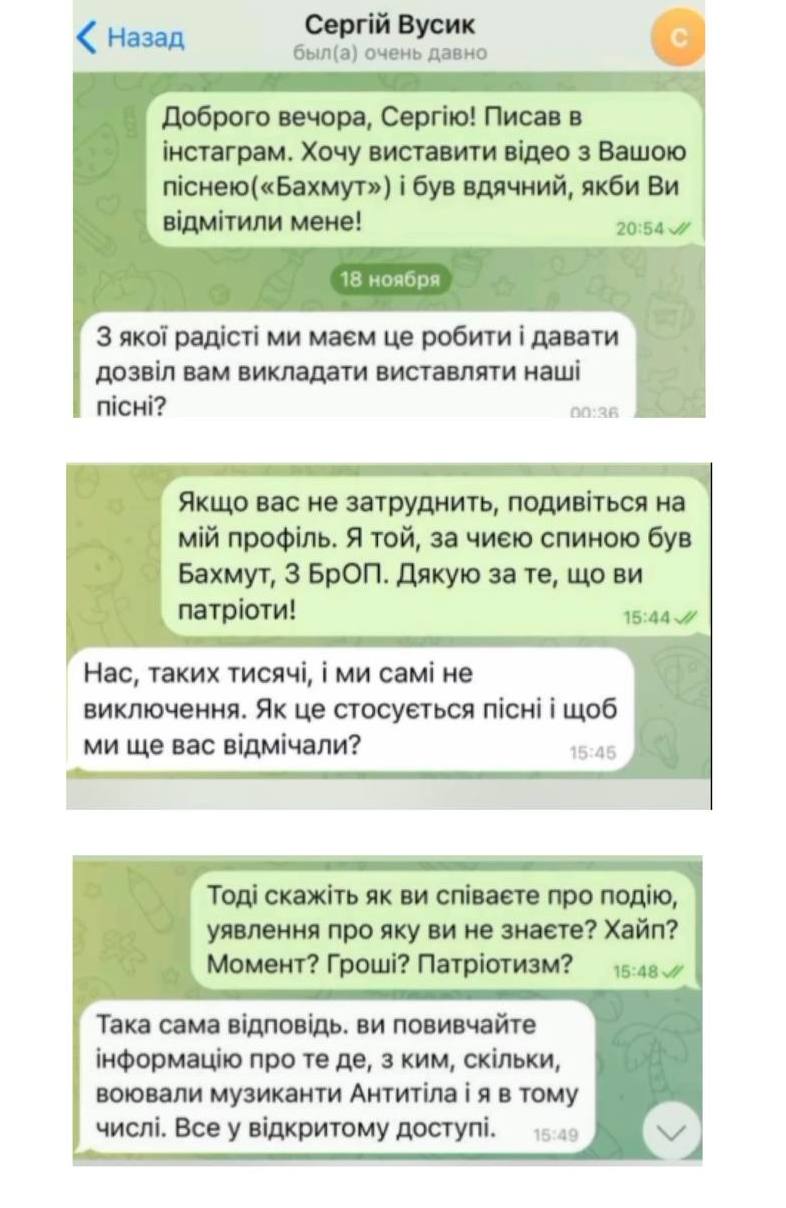"Друзья, хочу поделиться с вами ситуацией, которая меня очень-очень впечатлила. Мы вдохновились создать видео о самой главной битве моей жизни - битву под Бахмутом. О том, как я получил ранение и мою дальнейшую историю и путь, - рассказывает Виталий. - В поисках музыки мы остановились на композиции группы "Антитіла" "Фортеця Бахмут", которая по моему личному мнению идеально подходила под эту историю. Написав Сергею Вусыку, сооснователю группы "Антитіла", о разрешении использовать этот трек в нашем видео, я получил шокирующий ответ: "С какой радости мы должны это делать и давать разрешение вам выкладывать выставлять наши песни?".