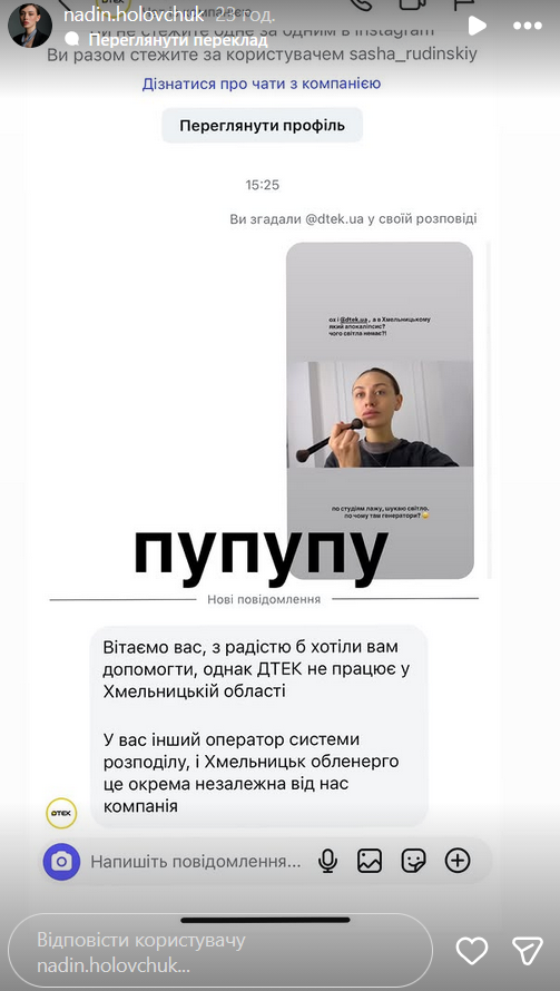 "Здравствуйте. С радостью хотели бы вам помочь, однако ДТЭК не работает в Хмельницкой области. У вас другой оператор системы распределения. Хмельницкоблэнерго это отдельная, независимая от нас компания", - ответили представители компании в личных сообщениях.