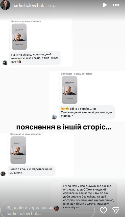 "Ох и ДТЭК, а в Хмельницком какой апокалипсис? Почему света нет? По студиям лажу, ищу свет. Какова стоимость генераторов?", - написала участница "Холостяка" у себя в Instagram-историях.