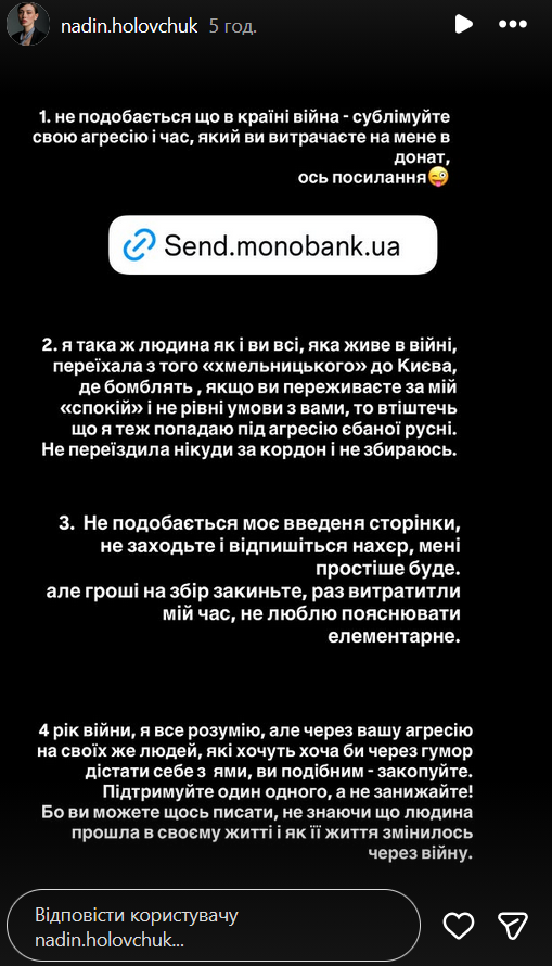 "Я такой же человек, как и вы все, который живет в условиях войны. Переехала из Хмельницкого в Киев, где бомбят, если вы переживаете за мой "покой" и неравные условия с вами, то радуйтесь, что я тоже попадаю под агрессию россиян. Не переезжала никуда за границу и не собираюсь, - написала она. - Не нравится мое ведение страницы, не заходите и отпишитесь на х*р, мне проще будет, но деньги на сбор забросьте, раз потратили мое время. Не люблю объяснять элементарное. 4-й год войны - я все понимаю. Но из-за вашей агрессии на своих же людей, которые хотят хотя бы через юмор выбраться из ямы, вы подобным закапываете. Поддерживайте друг друга, а не занижайте! Потому что вы можете что-то писать, не зная, что человек прошел в своей жизни и как его жизнь изменилась из-за войны".