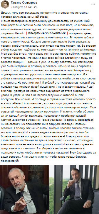 Начинающая артистка кино Татьяна Острецова обвинила коллегу, актера Владимира Владимирова, в сексуальных домогательствах. Девушка не только выступила с публичным сообщением, но и обратилась в полицию с заявлением, в котором просит наказать обидчика.
