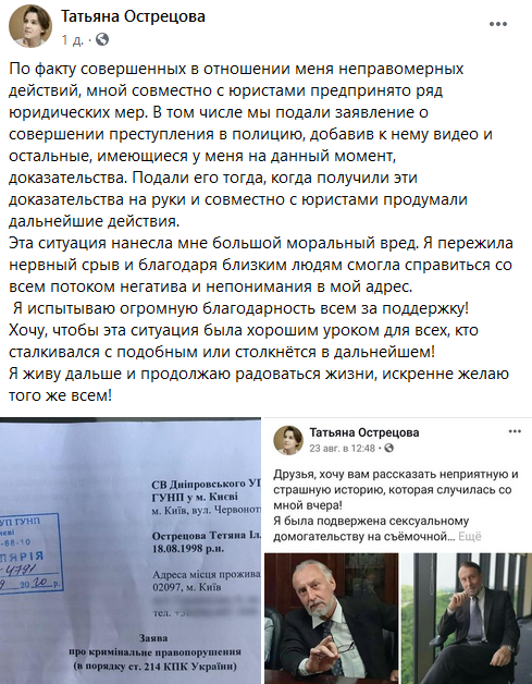 "По факту совершенных в отношении меня неправомерных действий, мной совместно с юристами предпринято ряд юридических мер. В том числе мы подали заявление о совершении преступления в полицию, добавив к нему видео и остальные, имеющиеся у меня на данный момент, доказательства", - призналась Острецова.
