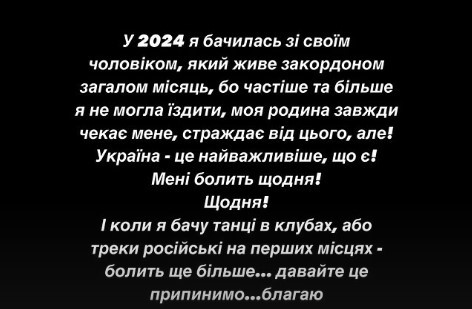 "Украина – это самое важное, что есть! Мне болит каждый день! Каждый день! И когда я вижу танцы в клубах или треки русские на первых местах – болит еще больше… давайте это прекратим… умоляю", - написала певица.