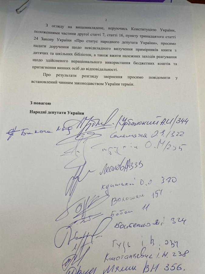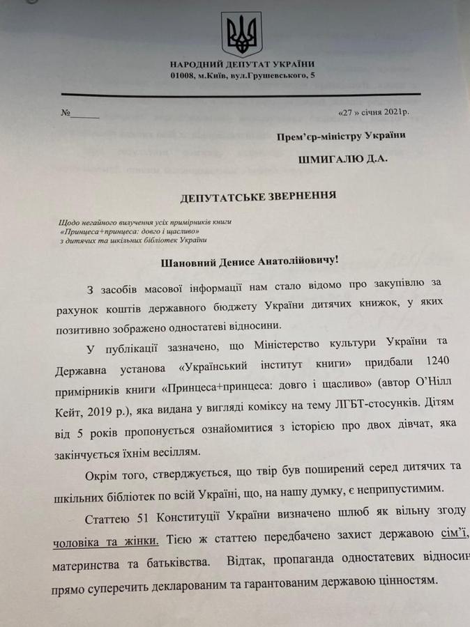 Согласно опубликованному документу, инициатором обращения стал нардеп от партии "За майбутньє" Анатолий Урбанский, который назвал себя сторонником "традиционных семей и ценностей в Украине". В свою очередь, издательство "Рідна мова", ответственное за перевод и публикацию книги, категорически с этим не согласилось.
