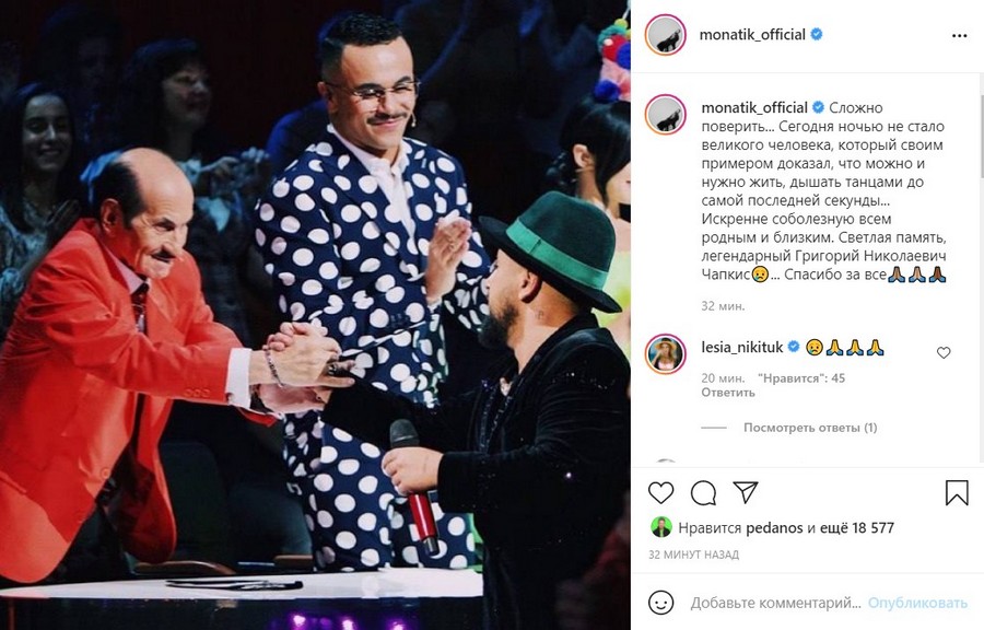Утром 14 июня украинские знаменитости в Instagram почтили память покойного Григория Чапкиса - о смерти танцора, хореографа и народного артиста Украины стало известно вечером 13 числа. Чапкису был 91 год.