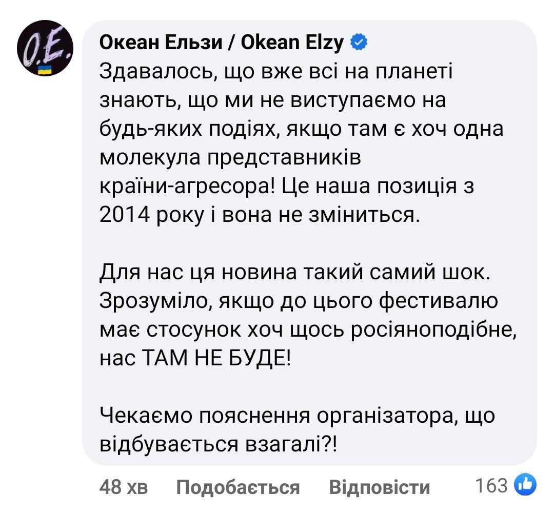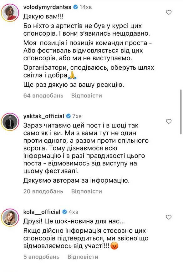 Одними из первых на эту ситуацию отреагировали артисты из коллектива "Океан Эльзы". В комментариях они отметили, что отказываются от участия в проекте, к которому имеют отношение россияне. Вслед за группой такое же мнение начали транслировать и другие звезды. которые должны были присутствовать на мероприятии: The Hardkiss, Yaktak, Alyona Alyona, KOLA, Владимир Дантес и Антон Вельбой. Их комментарии по этому поводу можно увидеть на странице ниже: