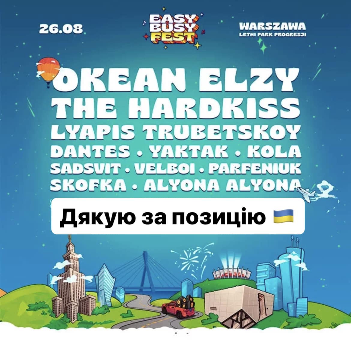 Музыкальный фестиваль Easy Busy Fest, который был запланирован на 26 августа в Варшаве с участием многих украинских звезд, отменили. Причиной послужило то, что одними из спонсоров оказались россияне.