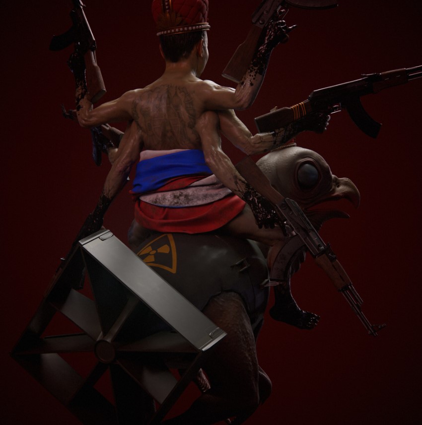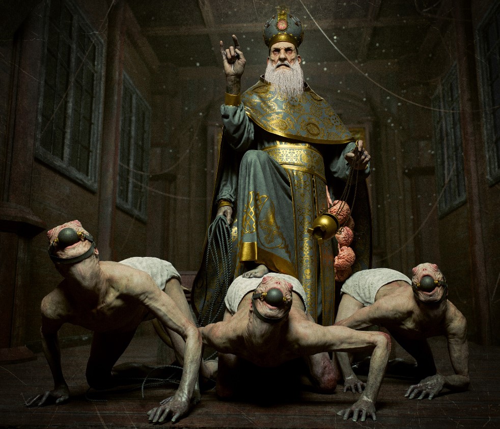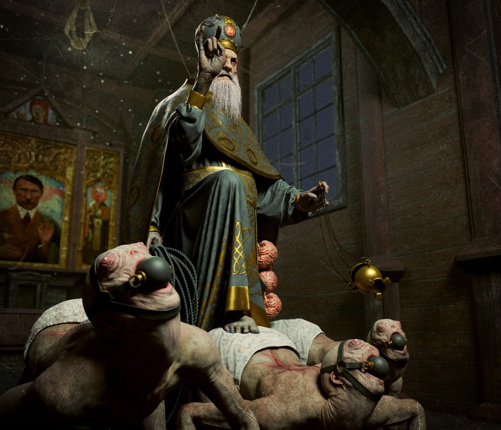 Снимки художник опубликовал на сайте Art Station, а также поделился деталями о них. Патриарха Кирилла художник изобразил преступником. Люди, подчиняющиеся ему, нарисованы без глаз, с закрытым ртом, без права высказать свое мнение. На заднем плане автор изобразил портрет Гитлера.