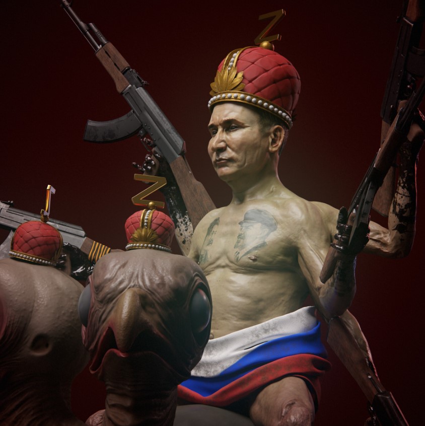 Кремлевского диктатора художник нарисовал с оружием в руках, короной на голове, на которой виднеется зловещий символ рашистов Z, а вместо одежды у президента РФ российский флаг. Он сидит на мифическом двуглавом создании, на груди у диктатора видны две татуировки – портреты Ленина и Сталина.