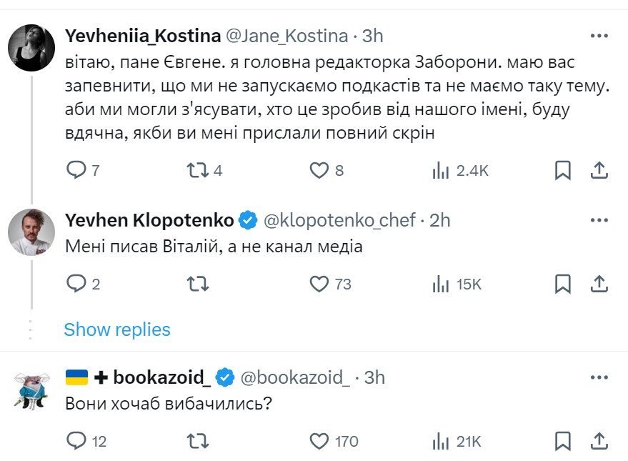 Как можно увидеть на опубликованных скриншотах, в переписке говорится о некоторых договоренностях. Клопотенку якобы предлагает сотрудничество редактор "Заборони", не который не уточняет своего имени. В сообщении мужчина рассказывает, что издание создает рубрику подкастов и хочет пригласить Евгения в качестве гостя первого выпуска. Дальше человек, назвавший себя представителем медиа, интересуется у кулинара, сколько будет стоить запись выпуска с ним, на что тот отвечает, что обычно это не стоит ничего.
