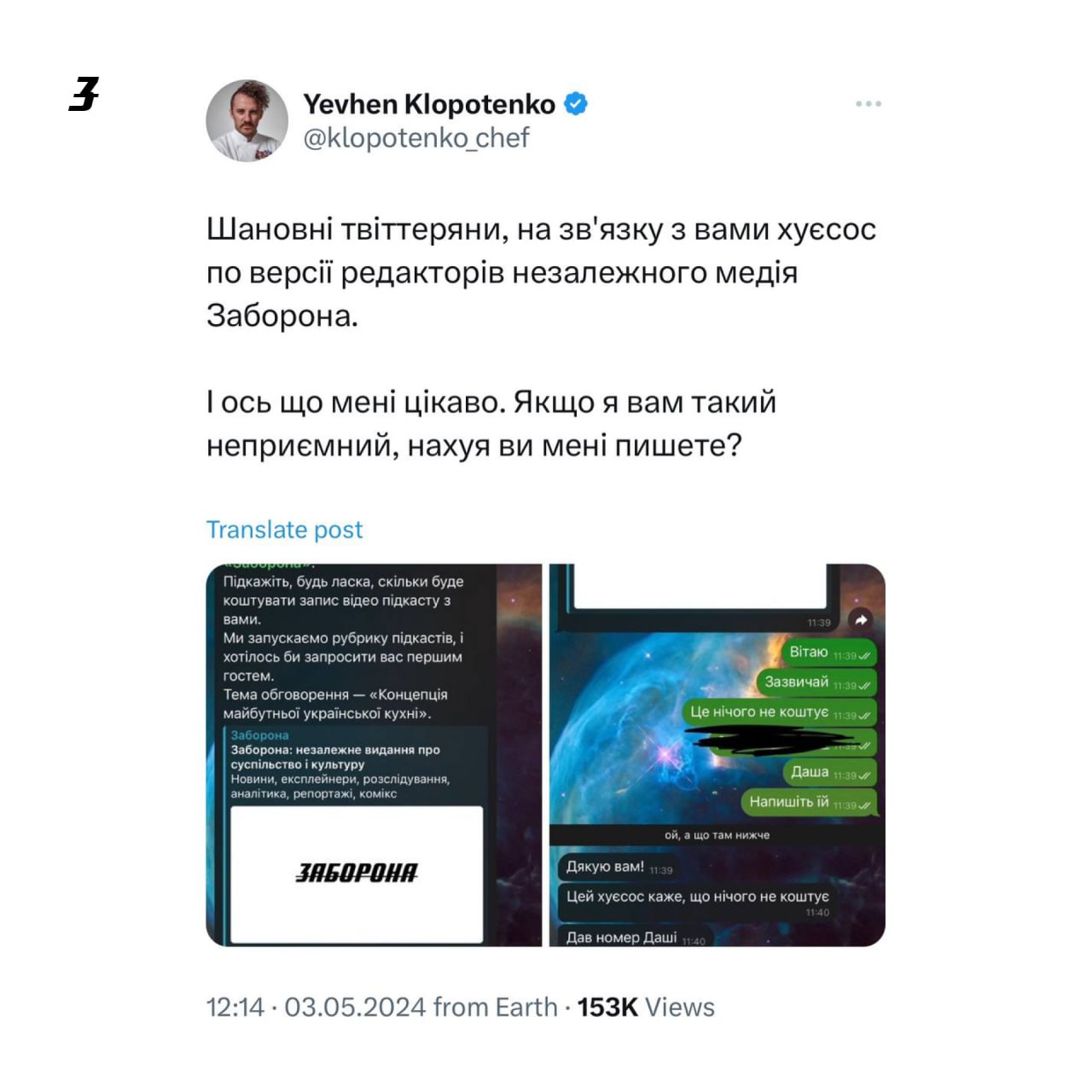 Евгений Клопотенко обнародовал в сети скриншоты переписки с якобы редактором издания "Заборона", предлагавшим ему сотрудничество. Как бы не угадав с чатом, так называемый представитель медиа обозвал шеф-повара нецензурными словами, и ответ со стороны кулинара не заставил себя ждать.
