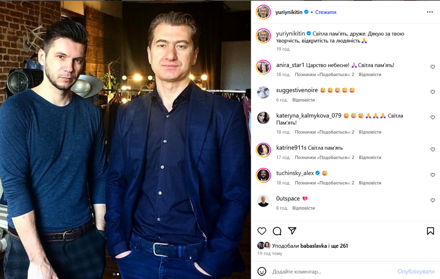 На трагедию также отреагировали украинские знаменитости, которые знали его лично и имели общие проекты. Среди них – продюсер Юрий Никитин, модель и "Мисс Вселенная Украина" Анна Неплях, экс-участница группы "НеАнгелы" Слава Каминская, режиссер Игорь Субочев, певец KISHE, ведущий Алексей Суханов.