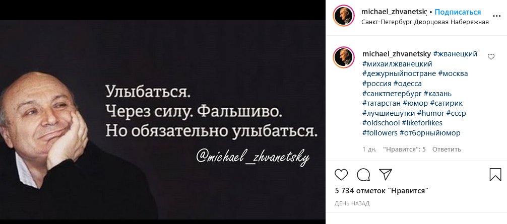 В своем последнем сообщении Жванецкий призывает подписчиков всегда улыбаться несмотря ни на что. "Улыбаться. Через силу. Фальшиво. Но обязательно улыбаться", - гласит надпись на опубликованном снимке с портретом сатирика.