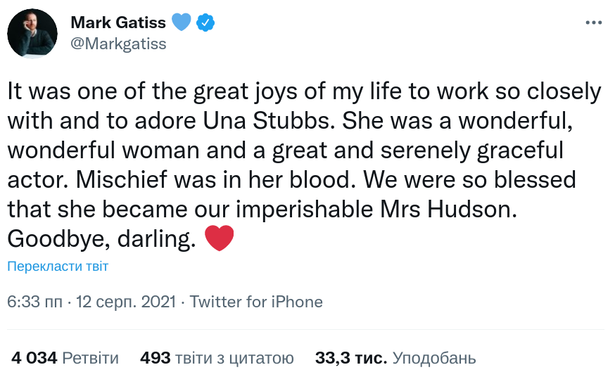 "Работать в тесном контакте с Уной Стаббс было одной из величайших радостей в моей жизни. Она была замечательной женщиной, прекрасной и безмятежно грациозной актрисой. Шалости были у нее в крови. Мы были так счастливы, что она стала нашей нетленной миссис Хадсон. До свидания, дорогая", - написал он в Twitter.