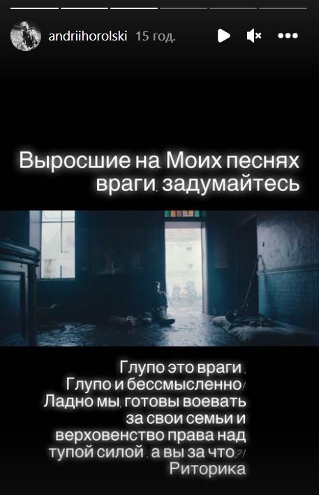 Так, на этот раз знаменитый защитник обнародовал в Instagram stories, в которых обратился к россиянам, которые выросли на его песнях. Хлывнюк посоветовал врагам задуматься о том, за что они воюют и чьи интересы защищают.