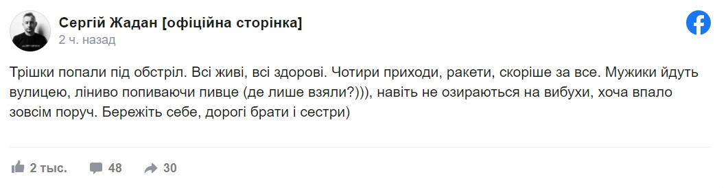 Украинский писатель Сергей Жадан попал под обстрел российских оккупантов. На своей странице в Facebook он рассказал, что все люди, которые находились в этот момент рядом с ним, целы и невредимы.