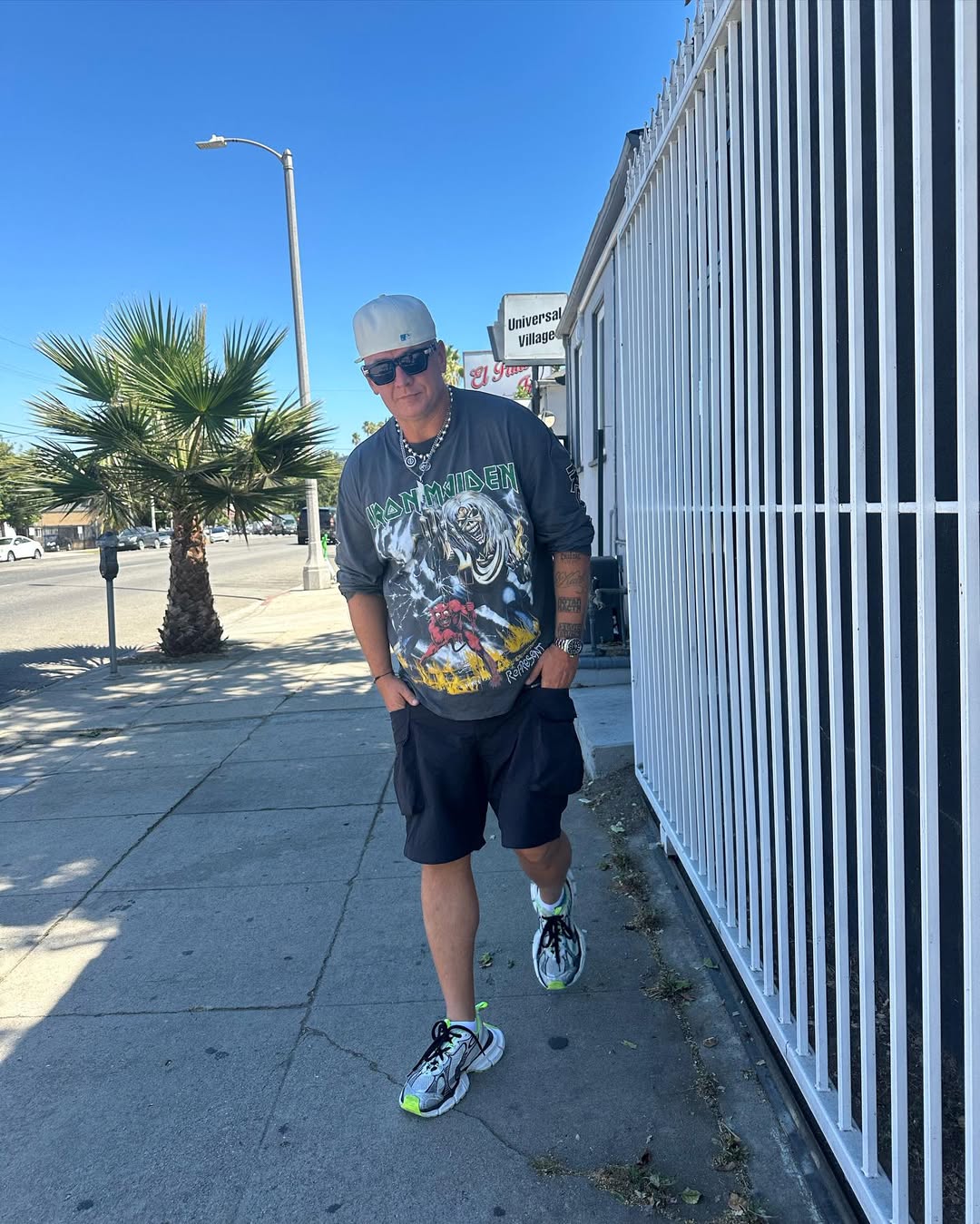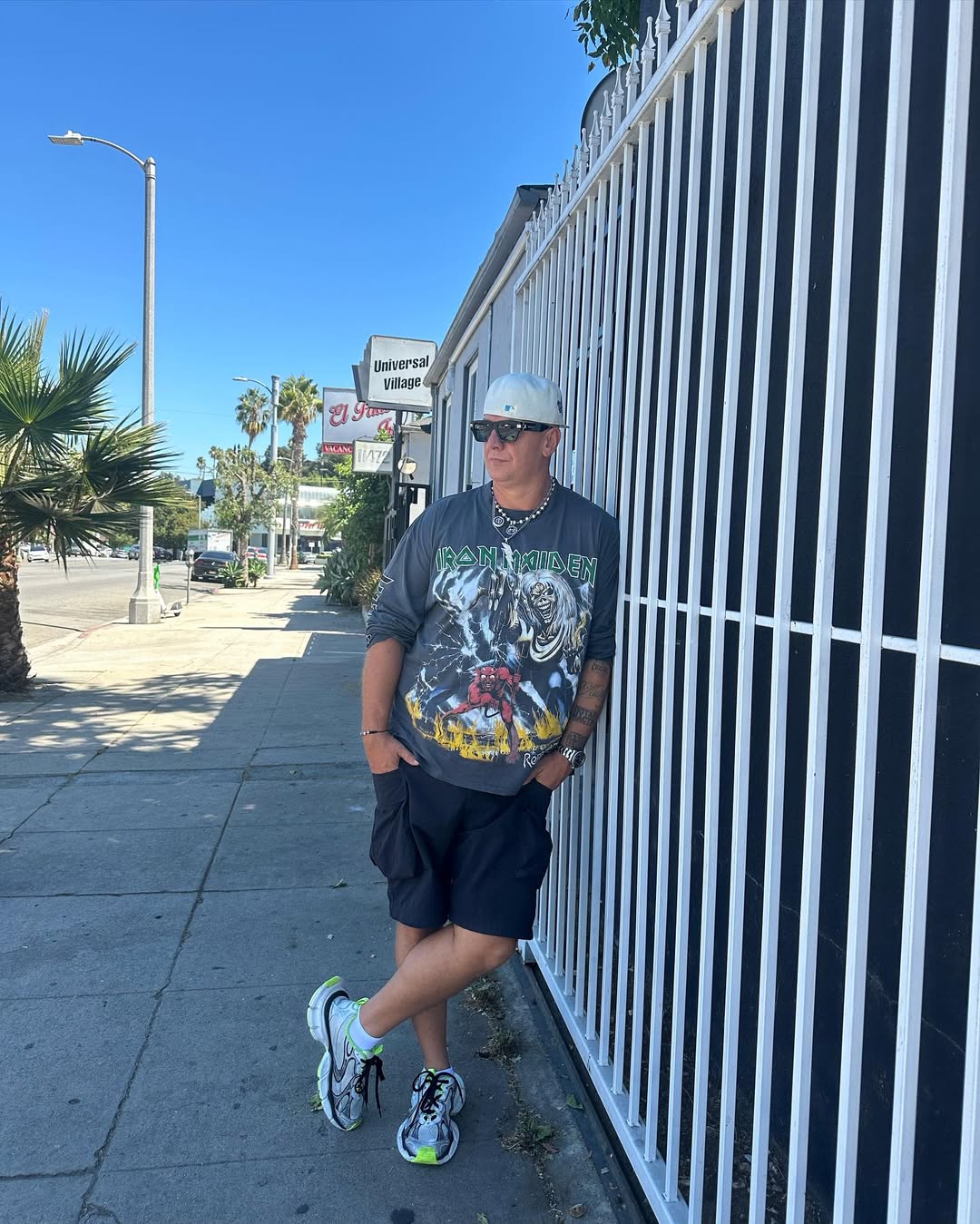 Рэпер был одет в шорты, кроссовки и футболку с символикой рок-группы Iron Maiden. Он дополнил свой рэперский образ солнцезащитными очками и бейсболкой, козырек которой развернул назад.
