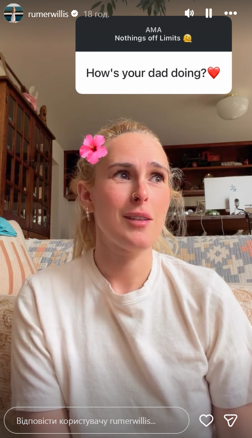 Об этом рассказала старшая дочь актера от брака с Деми Мур – 37-летняя Румер Уиллис, отвечая на вопросы подписчиков в Instagram. Один из них поинтересовался состоянием здоровья ее известного отца.