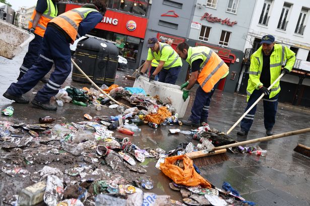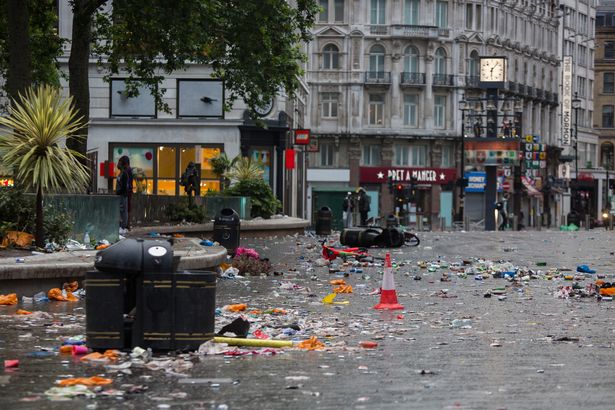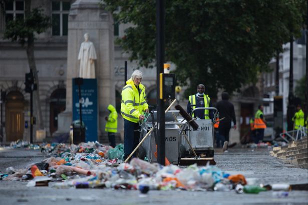 Исследование компании по сбору мусора Business Waste показало, за один лишь вечер воскресенья на улицах городов появилось более миллиона пустых пивных бутылок, 150 тыс. пластиковых стаканов, 200 тыс. лотков для еды на вынос, 100 тыс. коробок для пиццы и 150 тсы. английских флагов.