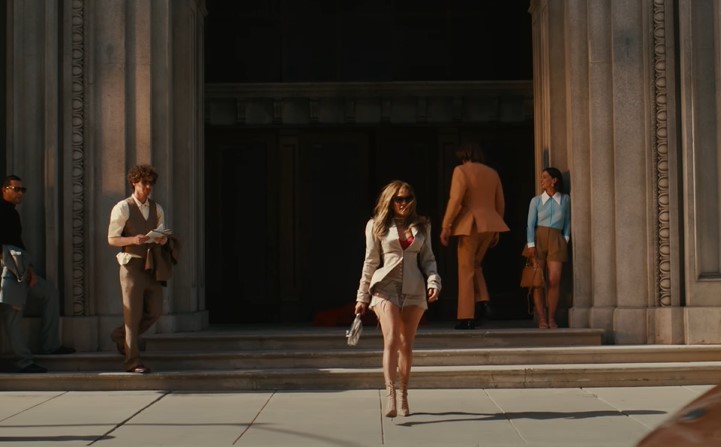 На некоторых кадрах можно увидеть, как звезда эффектно прогуливается по улицам Нью-Йорка в коротком жакете и юбке, появляется на высоком каблуке на столе в заведении, а также принимает душ.