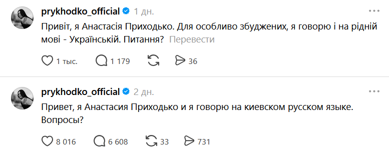 Как пишет "Суспільне Чернівці", на днях артистка написала в Threads, что общается на "киевском русском языке", чем вызвала волну возмущения среди пользователей. После критики она заявила, что "говорит и на родном языке - украинском", однако это не уменьшило негативной реакции.