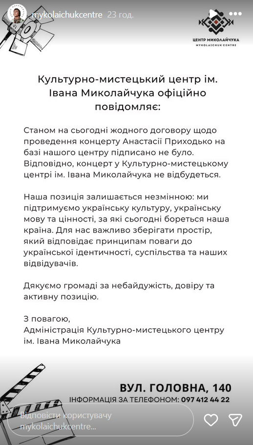 Жители Черновцов начали массово обращаться в администрацию Центра Миколайчука, где должен был пройти концерт Приходько, с требованием не предоставлять площадку для его проведения. В результате заведение не стало подписывать договор с организаторами выступления.