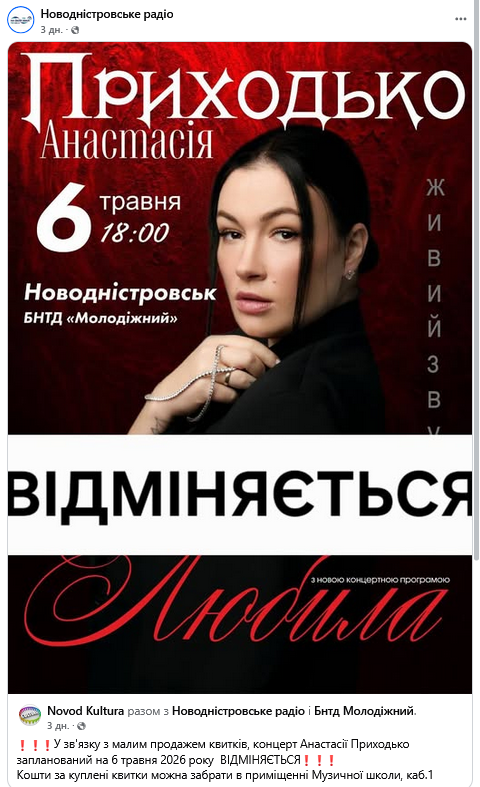 Кроме этого проблемы с концертами певицы возникли и в Новоднестровске Черновицкой области. Там выступление отменили за день до появления скандального поста, но по другой причине - из-за низкой продажи билетов.