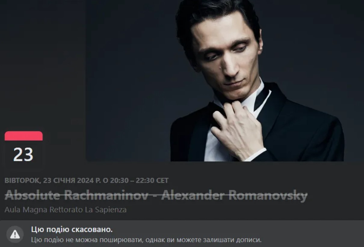 Сорвать концерт Романовского удалось благодаря активной позиции украинцев, нашедших способ восстановить справедливость. Накануне около десяти общественных организаций пообещали протестовать во время мероприятия, а Stand for Ukraine.it написали открытое письмо ректору и мэру Рима. К взлому сайта заведения была причастна активистская группа "Анонимус", пишет издание "Укринформ".
