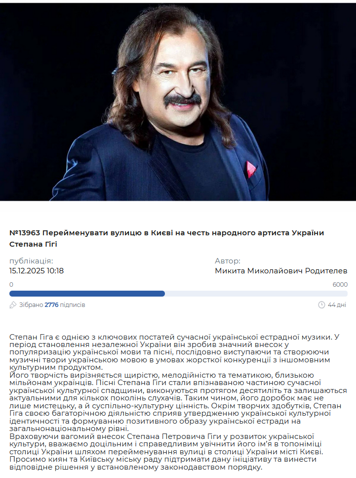 "Это важный жест памяти и уважения Маэстро, чья музыка стала частью истории Украины. Поддержите эту инициативу – сохраним имя Степана Гиги в сердце столицы!", – говорится в посте.