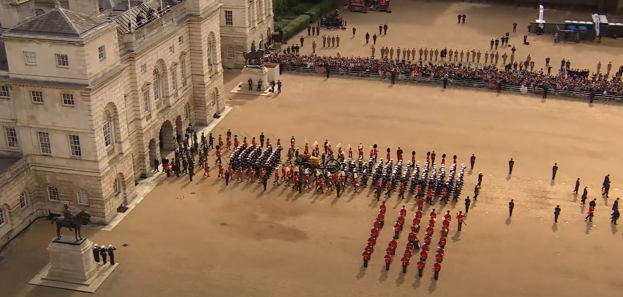 15:25 - Процессия прибыла к арке Веллингтона. Носильщик поднимет гроб с государственного лафета и поместит его в государственный катафалк, прежде чем машина отправится в Виндзор. Прозвучит королевский салют и национальный гимн. Затем король Чарльз и члены королевской семьи отправятся вслед за государственным катафалком.
