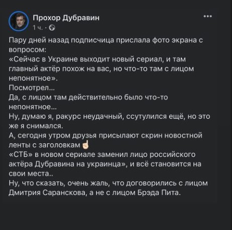 "Казалось бы, все хорошо: нас ждет украинский драматический сериал с классными актерами. Но есть одна проблема: одного из героев не существует, это дипфейк (методика синтеза изображения человека, базирующегося на искусственном интеллекте). На самом деле это российский актер Прохор Дубравин, много лет снимавшийся в Украине, однако после вторжения ни словом не обмолвившийся о войне. И теперь на своей странице в соцсети он поздравляет россиян с днем победы. Неужели Прохор совершил пластическую операцию, чтобы появиться в украинском сериале? Нет! "Пластическую операцию" ему совершил телеканал СТБ. После инцидента с сериалом "Крепостная" канал очень осторожно относится к появлению россиян в своих продуктах. Украинское лицо, которым заменили Дубравина, приняли у актера Дмитрия Саранскова", - рассказал в своем видео Петр Крылов.
