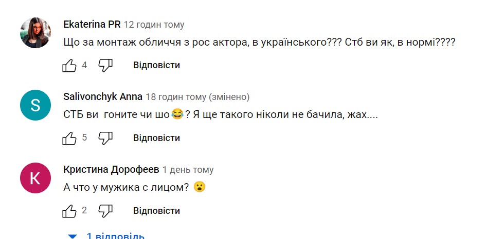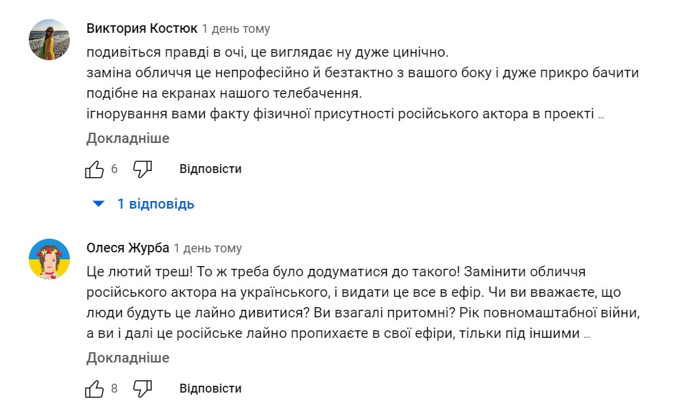 Больше всего замена лица дипфейком возмутила украинское актерское сообщество. Скандал прокомментировали такие артисты, как Петр Крылов, Артур Логай, Тарас Цымбалюк, Григорий Бакланов и другие.