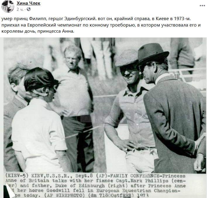 На другом снимке принц Филипп запечатлен в профиль. "Умер принц Филипп, герцог Эдинбургский. Вот он, крайний справа, в Киеве в 1973-м. Приехал на Европейский чемпионат по конному троеборью, в котором участвовала его и королевы дочь, принцесса Анна", - написала пользовательница под ником Хина Члек.