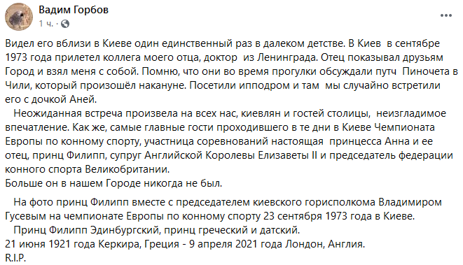 "Видел его вблизи в Киеве один единственный раз в далеком детстве, - вспоминает пользователь Вадим Горбов. - Неожиданная встреча произвела на всех нас, киевлян и гостей столицы, неизгладимое впечатление. Как же, самые главные гости проходившего в те дни в Киеве Чемпионата Европы по конному спорту, участница соревнований настоящая принцесса Анна и ее отец, принц Филипп, супруг Английской Королевы Елизаветы II и председатель федерации конного спорта Великобритании".