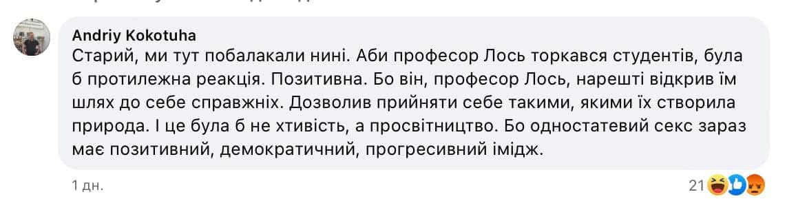 "Если бы профессор Лось касался студентов, была бы противоположная реакция. Положительная. Потому что он, профессор Лось, наконец открыл им путь к себе настоящим. Позволил принять себя такими, какими их создала природа. И это была бы не похоть, а просвещение. Потому что однополый секс сейчас имеет положительный, демократический, прогрессивный имидж", - считает Кокотюха.