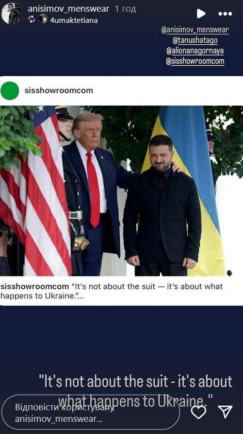 picture Владимир Зеленский в костюме Виктора Анисимова Фото: instagram.com/sisshowroomcom